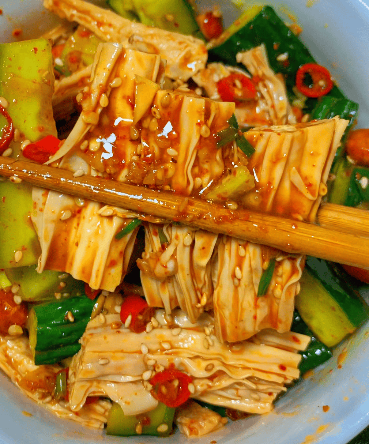 凉拌腐竹的家常做法 首先,准备好所需的食材干腐竹适量黄瓜半根胡萝卜半根花生米一小把香菜两棵大蒜几粒辣椒粉适量白芝麻适量生抽适量陈醋适量盐适量白糖少许香油适量1 腐竹提前用冷水泡软,然后切成小段,黄瓜和胡萝卜洗净切成菱形片,香菜切段,大蒜切末备用泡腐竹的。