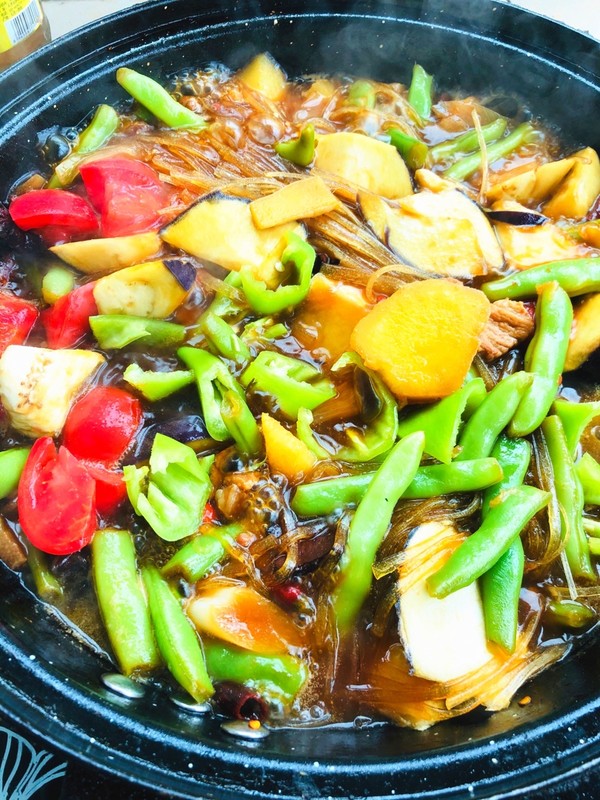 1将茄子撕成小段,芸豆切成段西红柿切成小块辣椒去籽去筋切块大头菜切成菱形备用宽粉用开水浸泡备用2在锅内留250克油烧至五成开后,将茄子先放入其中炸软后捞出控油,再炸芸豆,见芸豆发软后捞出控油3在锅内留少许底油,放入葱姜炸锅,待爆出香味后下五香粉胡椒粉盐鸡精。