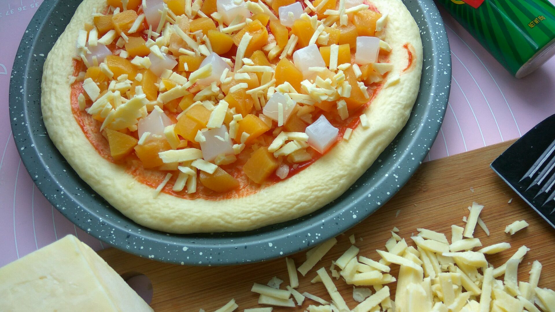 7、制作步骤如下1把发酵好的面团做成饼皮放入8寸披萨盘中,中间叉一些小孔,防止面皮鼓起来,盖盖儿进行二次发酵2洋葱切片,青椒胡萝卜火腿分别切丁,培根用锅煎一下去掉水3菜丁炒一下,炒时不放油4发好的饼皮上抹番茄酱,撒一层芝士,撒罗勒叶,放菜丁火腿肠5放芝士。